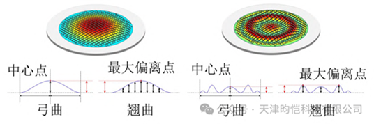 翘曲度定义及翘曲成因:在现行标准中,针对晶圆或硅片的变形定义了弓曲与翘曲两种形式,如下图所示。