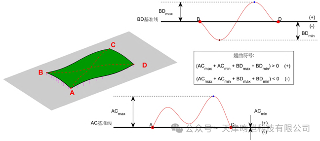 此外,在ED-7306 标准中,绝对参考面不再采用 SEMI MF534与 SEMIMF657 中的三点接触法,而是选取全场形貌的最小二乘拟合得到的虚拟平面。且其对翘曲的定义不再局限于局部三点测量,能够反映整体的翘曲状态凭借其更高的适用性,该定义在后续得到了广泛采纳,并已成为商业化翘曲测量设备普遍遵循的标准。 需要特别指出的是,在翘曲测量中,用于判定翘曲符号的基准线与用于计算翘曲值的绝对参考面实为两个不同的概念。前者仅依赖于对角线上的两个顶点及其极值数据来确立符号,而后者则以全场数据为基础,计算出绝对翘曲值。这种差异导致了ED-7306 标准中翘曲符号计算方法的局限性,具体表现在以下: