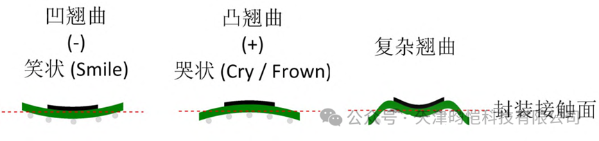 鲁棒性较差:该方法仅基于四个角点与四个极值点进行计算,易受到测量噪声、局部异常或表面特征的显著影响,从而导致符号判定的不稳定性。为避免 ED-7306 标准中翘曲符号带来的困扰,JEDEC 固态技术协会在其标准JESD22-B112B中通过形态学方法将翘曲分为凸翘曲(-)、四翘曲(+)及复杂翘曲,并在最新版本 JESD22-B112C中延续此分类,如图所示。