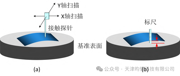 接触测量法:接触测量方法通常需要将待测样品放置在标准平面上,通过探针法或标尺法逐点测量翘曲量,如下图所示。