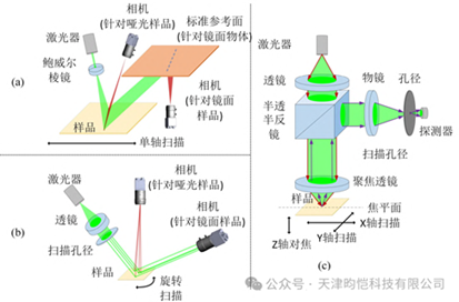 共聚焦技术是一种基于光学成像的高精度测量技术,在三维形貌测量和微观结构分析中具有显著优势。其原理是通过将光源聚焦于样品表面,利用针孔滤波器仅允许来自焦平面的光信号通过,从而抑制其他平面的散射光,最终获得高纵向分辨率的图像共聚焦系统的结构如上图(c)所示。该系统能够在纵向上实现极高的分辨率,特别适合用于微小结构的三维重建和精细表面形貌测量。传统光学显微镜由于无法有效抑制非焦平面上的光信号,通常会导致图像模糊,尤其是在深度方向上。而共聚焦系统通过针孔设计能够消除这些干扰,生成更为清晰的三维图像。然而:共聚焦技术也存在一些局限性。首先,由于系统复杂且成本较高,共聚焦技术的普及和应用受到限制。其次,共聚焦系统通常依赖逐点扫描或并行阵列扫描:这在测量大面积样品时会导致采样密度和效率偏低,尤其是在需要对大尺寸样品进行动态测量时,如何在采样速度与分辨率之间取得平衡,仍是一个技术挑战。