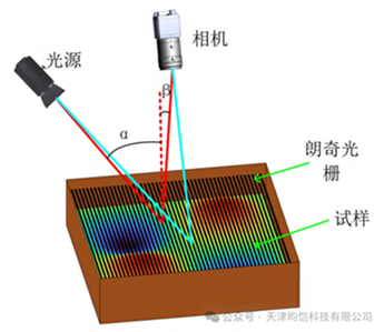 阴影莫尔法:莫尔法的核心在于参考栅与变形栅的叠加,从而通过频域信息分析出变形栅所对应的形貌及位移。由于物体表面制栅对样品表面有较高要求且难以控制精度,阴影莫尔法作为一种典型方法在翘曲测量中得到了更广泛的应用。其通过将高精度物理栅(参考栅)与投射在样品表面的影子(等效为变形栅)叠加,利用相机捕捉频率叠加后的条纹图案来分析出样品表面高度的变化。值得注意的是,虽然部分工作将条纹投影也称为投影莫尔(projection moiré),但由于其高度抽象化,在主流中一般不将其归类为莫尔法。阴影莫尔测量系统的典型设置包括一个准直光源、一个正对待测样品的相机以及一个贴近样品表面布置的朗奇(Ronchi)光栅,如下图所示。
