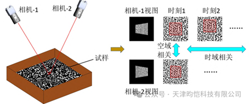 该方法通过对比物体在变形前后的图像,采用以逆高斯-牛顿为代表的相关性匹配算法,对物体表面各点位置进行追踪。其基本原理是在样品表面施加自然纹理或人工散斑图案,当样品发生变形时,这些图案会随之产生相应的位移和形变。通过高分辨率相机采集变形前后的图像,再利用子区域内灰度分布的变化来识别散斑图案的位移,从而能够在像素坐标系下精确计算出全场位移分布。进一步地,结合多视角成像所建立的立体匹配关系,还可以实现三维空间中表面形貌、位移以及应变信息的重建。以立体数字图像相关法为例,其设备结构如下图所示。